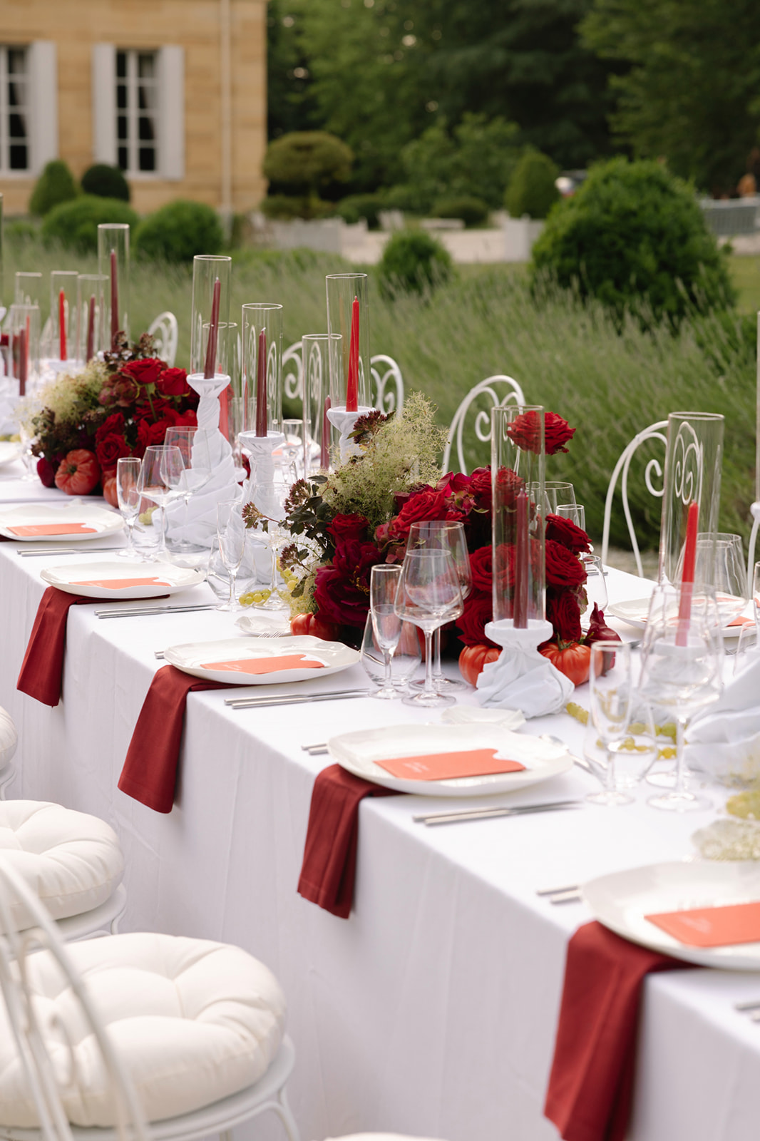 Les invités venus des quatre coins du monde ont découvert un décor d’une élégance rare : une allée bordée de cyprès, une réception au centre de l’allée, et des tables ornées de compositions florales moderne aux nuances chaude et romantique. Chaque détail était pensé pour refléter la beauté intemporelle de la Dordogne, région prisée pour ses paysages et son art de vivre à la française.