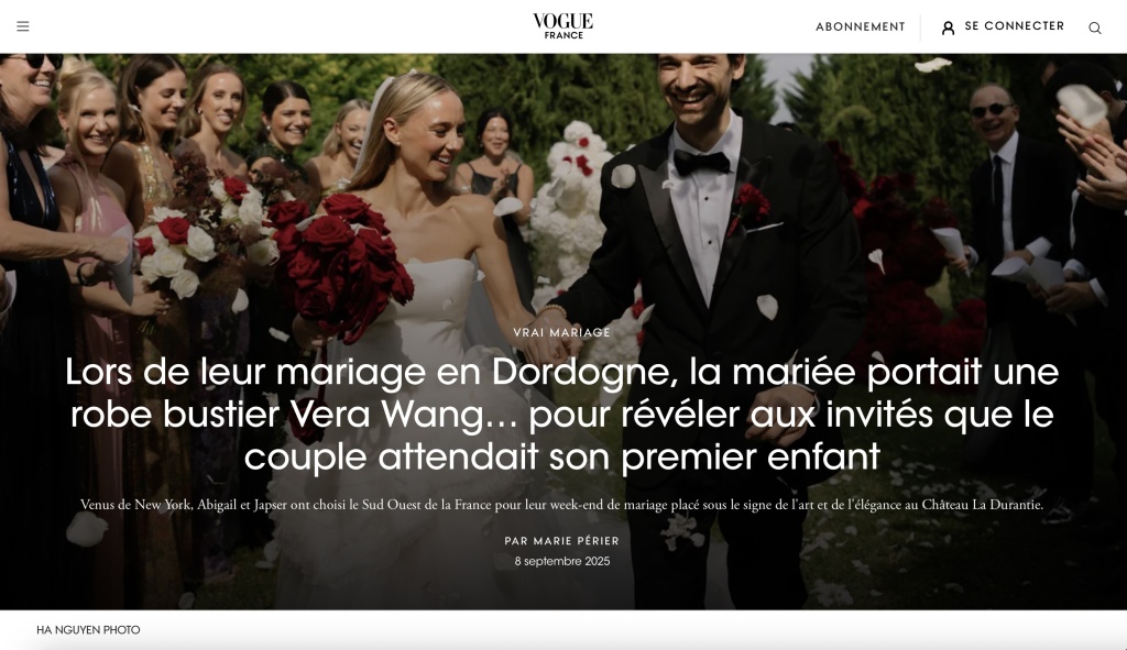 C’est au cœur de la Dordogne, au château La Durantie où le charme de la nature rencontre le raffinement de l’architecture française, qu’a eu lieu l’un des mariages les plus remarqués de la saison. Entre atmosphère bucolique et sophistication absolue, cette union d’Abby et Jasper venant de New York a attiré l’attention des professionnels du mariage… jusqu’à séduire la rédaction de Vogue France, qui lui a consacré une sublime parution.